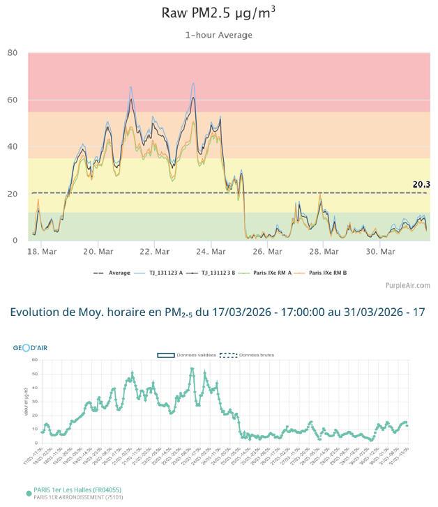 Nos capteurs à Paris ont détecté des concentrations élevées de particules lors de conditions de stagnation avec des vents calmes, permettant aux émissions locales de pollution de s’accumuler à des niveaux élevés en surface lors d’inversions de température, et lorsque la formation de particules était liée à des sources régionales provenant de l’épandage d’engrais. Ces mesures sont comparées aux données disponibles des réseaux de surveillance de la qualité de l’air à Paris et l’on constate une bonne concordance pour les PM2,5 (particules fines diamètre inférieur à 2,5 µm).